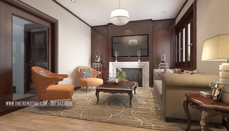 Mẫu lò sưởi bằng đá nhân tạo màu trắng đã tăng giá trị thẩm mỹ cho không gian phòng khách biệt thự tân cổ điển.
